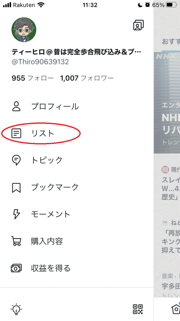 後は、リストを開く方法は、自分のアイコンをクリックした後に出てくる下の画像の「リスト」を選ぶと出てきます。